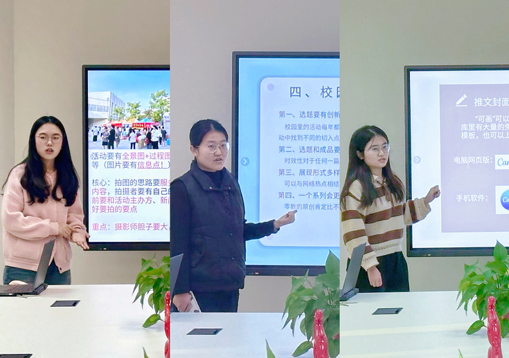 张玉荣为大家详细介绍了各类微信推文的撰写技巧,包括会议活动类、人物专访类、品牌宣传类、校园原创类等题材,并分享了提升写作技能的有效途径;孙乐越分享了微信公众号推文排版的技巧,她将文字的力量与视觉的美感完美融合,讲解了如何利用可画、秀米等工具使文稿呈现出最佳的排版效果,并强调在排版时不仅要做到图文并茂,还要注重参数设计的合理性;张晓娜针对校园网新闻撰写以及照片拍摄开展专题指导,从校园网新闻稿的特点切入,介绍新闻稿标题、导语、主体、结尾四部分的写作方法。她结合各类校园新闻拍摄案例,详细讲解了会议类、活动类、晚会类等题材的照片拍摄要点,并对构图技巧和误区进行细致讲解。