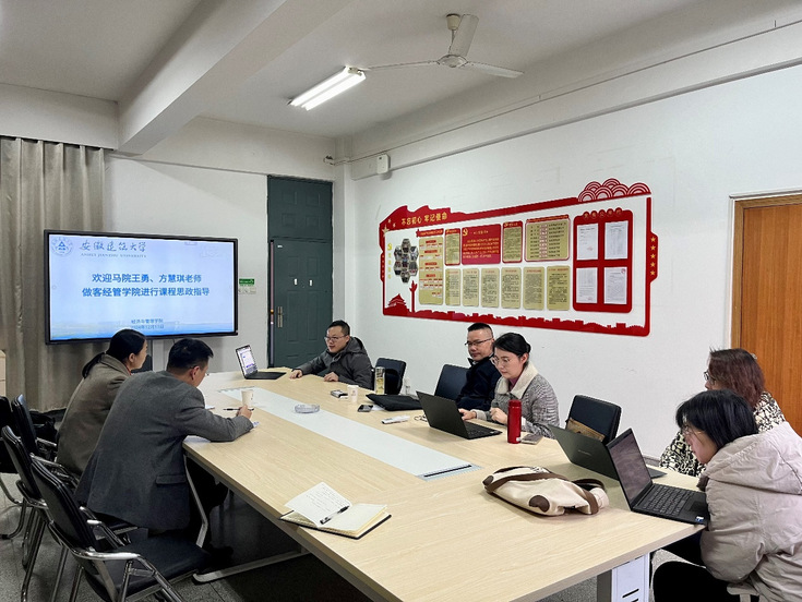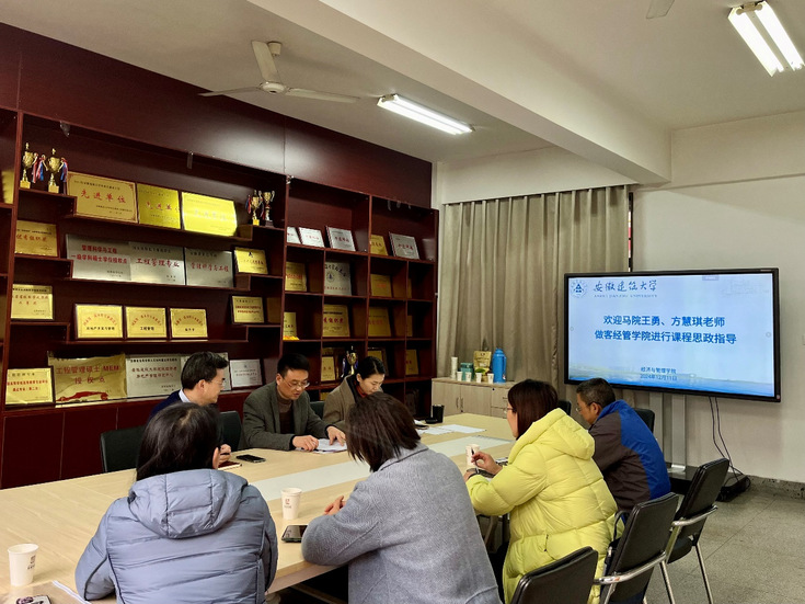 本网讯 为深入贯彻落实习近平总书记关于教育的重要论述和教育部《高等学校课程思政建设指导纲要》要求,落实立德树人根本任务,促进课程建设高质量发展,12月11日下午,经管学院邀请马克思主义学院王勇、方慧琪两位老师来院指导课程思政工作。此次活动由学院院长彭志胜主持,学院督导组成员及教师代表参加。