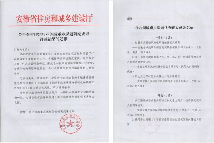 本网讯 近日,安徽省住房和城乡建设厅发布全省住建行业领域重点课题研究成果评选结果,我院教师刘艳、章蓓蓓执笔的研究报告《加快推进我省构建房地产新发展模式的对策研究》和《发展住房城乡建设领域新质生产力的路径研究》分获二等奖、三等奖。研究成果得到了安徽省住房城乡建设厅认可,并被通报表扬。
