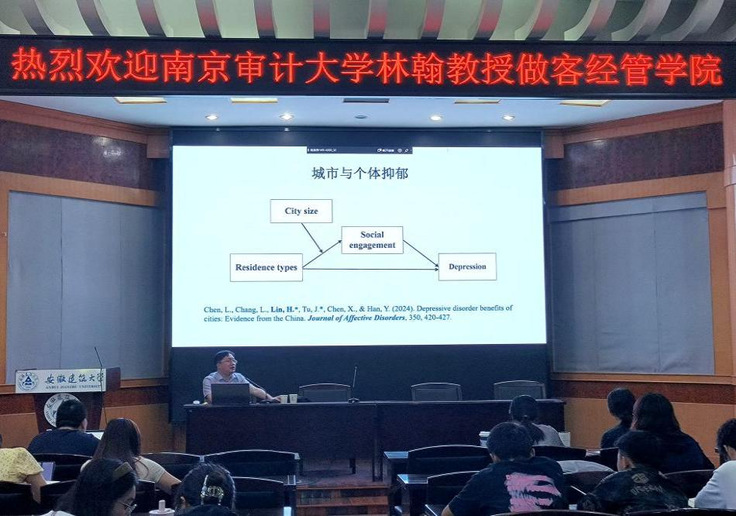 本网讯 4月18日,南京审计大学林翰教授应邀到经管学院举办题为“工程、社会与居民心理健康”的专题讲座。讲座由经管学院副院长章蓓蓓主持,学院教师、硕士研究生共80余人参加。
