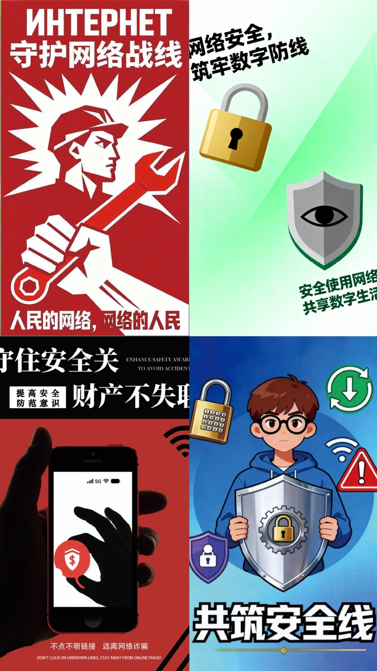 为激发学生对网络安全的主动思考,学院发起原创海报设计活动,得到全院学子热烈响应。同学们将网络安全知识与艺术创意深度融合,有的以漫画形式还原 “虚假购物”等典型场景,揭露诈骗套路;有的用对比色块搭配警示标语,强调 “保护个人信息” 的重要性。经过专业评审,多幅优秀作品获奖、在走廊、公众号、微博等渠道集中展示,不仅成为校园里的“安全风景线”,更以直观生动的方式让网络安全理念深入人心,带动全院形成 “学安全、懂安全” 的浓厚氛围。