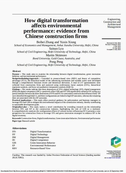 我院研究生在工程管理领域权威期刊《Engineering, Construction and Architectural Management》上发表最新研究成果