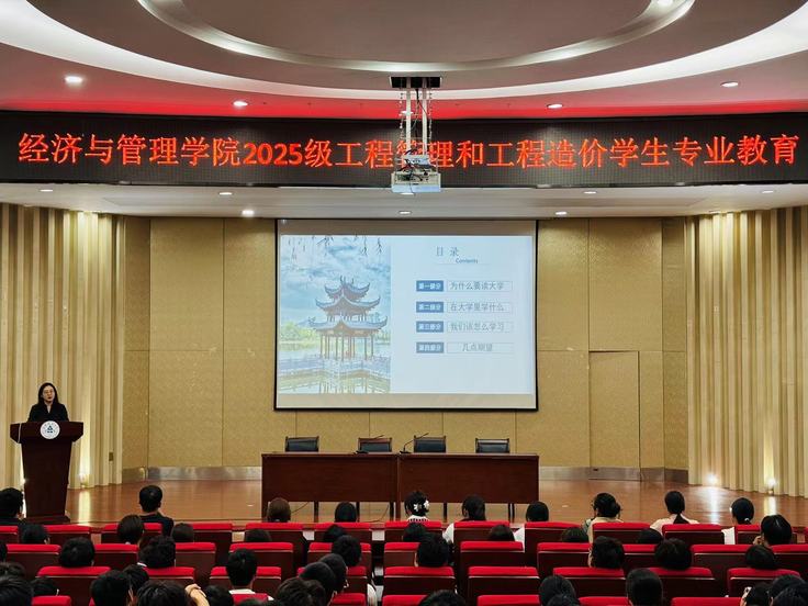 本网讯 2025年9月28日上午,工程管理系在金寨路校区图书馆报告厅举办2025级工程管理与工程造价专业新生入学教育暨学业导师见面会。经管学院副院长蔡弘、工程管理系主任杨苏、2025级新生学业导师刘家林、刘艳与全体2025级新生齐聚一堂,共同开启新学期的第一课。活动由学院副院长蔡弘主持。