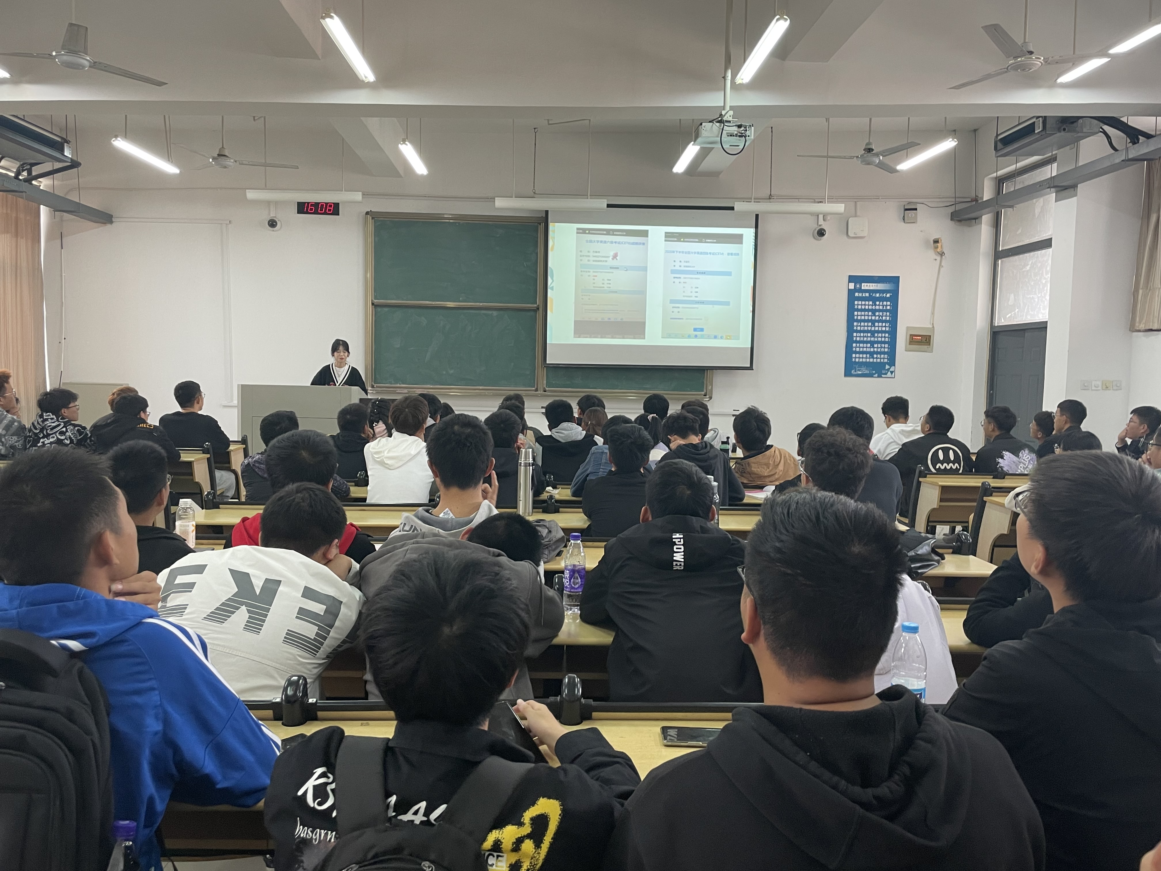 两位同学围绕着英语四级基本题型、答题策略、复习方法等方面进行了讲解和分析,全方位介绍了考试新题型和备考经验,重点对听力、翻译、写作等解答方法进行了交流,学长学姐们细致讲解,幽默的风格、认真的态度赢得了阵阵掌声。交流现场气氛活跃,同学们认真听讲,热情高涨,斗志满满。分享结束后,辅导员趁热打铁,在班级宣布开展英语学习打卡奖励活动,更加激起了同学们认真备考,向优秀迈进的信心和决心。