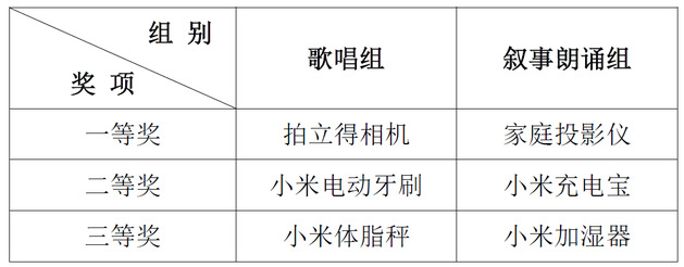 歌唱组和叙事朗诵组各设置一等奖一名,二等奖两名,三等奖三名,优秀奖若干名,我们会为获奖者颁发获奖证书并发放奖品,具体奖品设置如下: