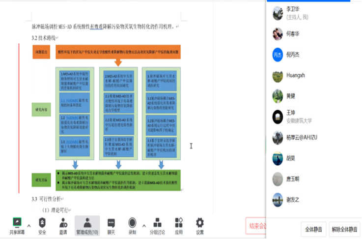 黄健副院长首先介绍了学校土木工程学科特区的筹备和建设历程,李卫华教授介绍了市政工程方向的建设目标、2022年度取得的成果以及2023年工作计划,倪丙杰教授对学院土木工程学科特区市政工程方向在人才队伍建设、学术交流开展以及高水平成果产出给予了详细指导。随后李卫华教授和何春华博士分别汇报了各自国家自然科学基金的撰写准备情况,就基金撰写过程中遇到的问题与倪丙杰教授进行了深入的交流。唐玉朝教授汇报了全椒污水处理厂中试实验现场遇到的问题,与倪丙杰教授共同探讨了可行的解决方案。胡昊副教授汇报了科研进展和科研思路,并就后续科研项目申报与倪丙杰教授进行了充分的交流。