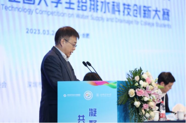 深圳环境水务集团有限公司吴晖董事长致辞,他提出,水是人类共同的事业,深圳环水集团一直致力于用科技创新推动水处理行业发展,厚植创新基因、集聚创新动力、提升创新活力并结合‍‍水务集团“AOA耦合厌氧氨氧化技术”“深水云脑”“冰浆清洗技术”等技术发展案例,强调科技创新对于给排水工作的提升有着至关重要的意义。在水处理行业科技蓬勃发展的时期,希望通过大赛激励给排水专业的在校生释放创新潜能,激发创新活力,更鼓励参赛学生们跟上时代趋势,立于浪潮之尖,在“深水杯”的舞台上,充分展现实力、特色和亮点,赛出水平,赛出优异成绩。