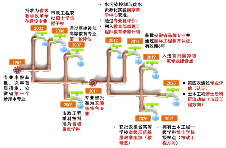 2002年,我校给水排水工程专业被评为省内第一批、我校第一个省级教学改革示范建设专业;2006年,市政工程获得硕士学位授予权;2007年,给水排水工程专业通过建设部专业教育评估;2009年,水污染控制与废水资源化实验教学中心获国家级实验教学示范中心,并于2013年通过教育部验收评审;2011年,给水排水工程专业被批准为安徽省特色专业;2012年,给水排水工程专业加入教育部第二批卓越工程师教育培养计划;2012年,给水排水工程专业通过国家专业教育评估(复评估);2012年,水污染控制与废水资源化实验室被批准为安徽省重点实验室;2013年,给排水科学与工程专业被批准为安徽省综合改革试点专业;2017年,通过国际工程教育认证,有效期6年;2018年,批准为安徽省卓越工程师教育培养计划2.0建设专业; 2019年,入选首批国家级一流专业建设点;2020年,批准为安徽省高等学校省级示范基层教学组织(教研室);2021年,拥有土木工程一级学科博士学位授权点(市政工程方向);2023年,第四次通过专业评估(认证),并拥有土木工程博士后科研流动站(市政工程方向),形成了完整的学士、硕士、博士和博士后人才培养体系。