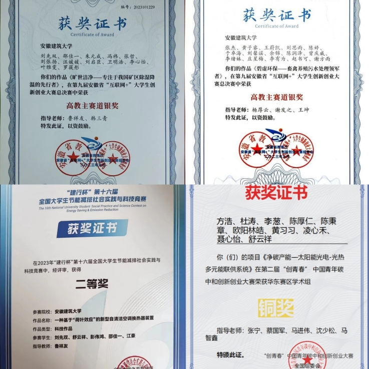 学科专业竞赛成果丰硕。2023年,学院学生获第十六届全国大学生节能减排社会实践与科技竞赛二等奖1项,第二十九届全国高等学校人工环境学科奖专业基础竞赛二等奖1项;获第八届安徽省“互联网+”创新创业大赛银奖1项,安徽省“挑战杯”银奖1项、铜奖1项,中国国际“互联网+”大学生创新创业大赛(安徽赛区)银奖2项、铜奖1项,“华骐-绿巨人杯”安徽省大学生生态环境创新创业大赛中获特等奖1项,一等奖4项;获2023年安徽省大学生GIS应用技能大赛一等奖1项,二等奖2项,三等奖2项;承办第六届“深水杯”全国大学生给排水科技创新大赛,组织参赛五个队伍,其中定向组获三等奖2项,创意组获特等奖1项、二等奖1项、三等奖1项。创新创业教育成效突出。2023年,指导开展大学生创新创业训练项目申报工作,获批国家级8项,省级30项,校级38项。