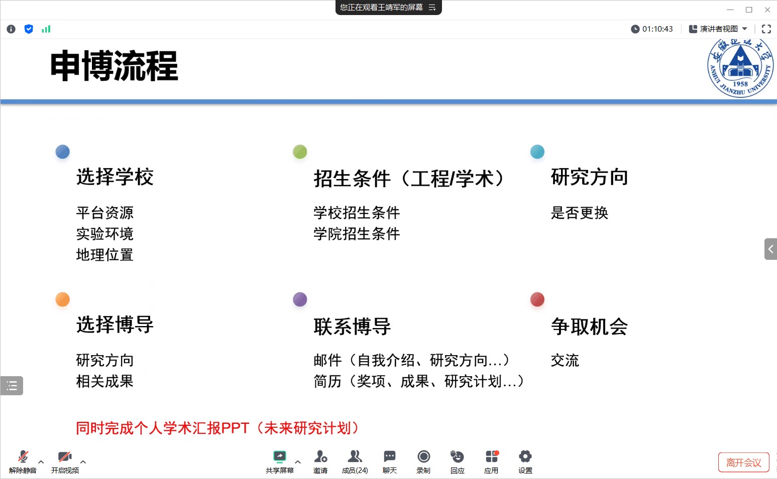 7月2日,环境与能源工程学院研究生会和环境与能源工程学院研究生第一党支部联合在线上举办了“申博考博暨就业线上经验分享交流会”。本期交流会邀请到了我校考取同济大学和河海大学的博士及入职安徽省招标集团的学长们分享申博考博和求职经验。