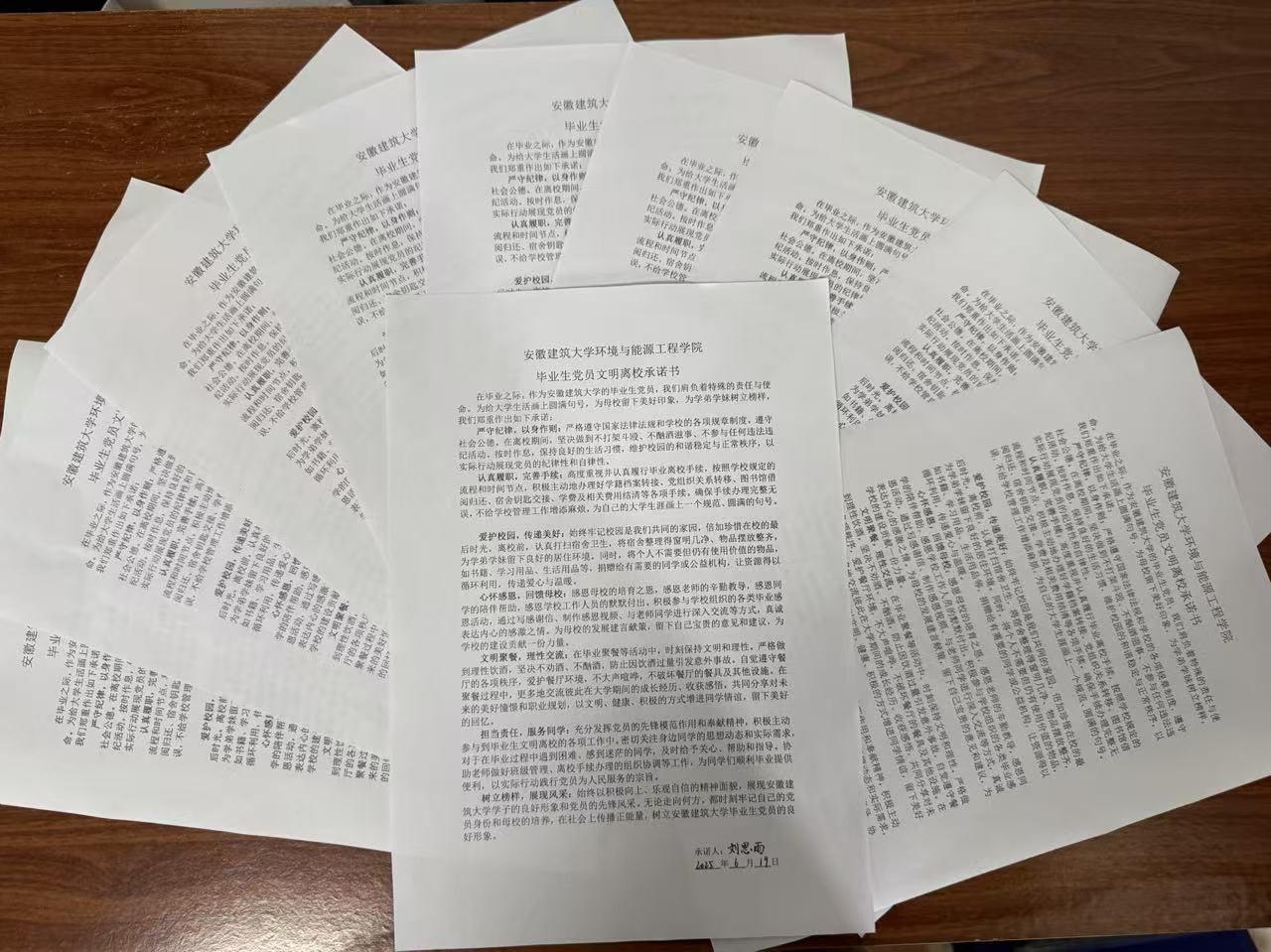 环能学院学生第一党支部毕业生党员举行“文明离校・党员先行”承诺仪式。他们面向党旗庄严宣誓,承诺 “三不三主动”:不损坏公物、不酗酒喧闹、不遗留垃圾,主动清理宿舍、主动帮扶同学、主动参与校园志愿服务。同时签订毕业生文明离校承诺书,用实际行动践行 “一名党员一面旗” 的承诺。