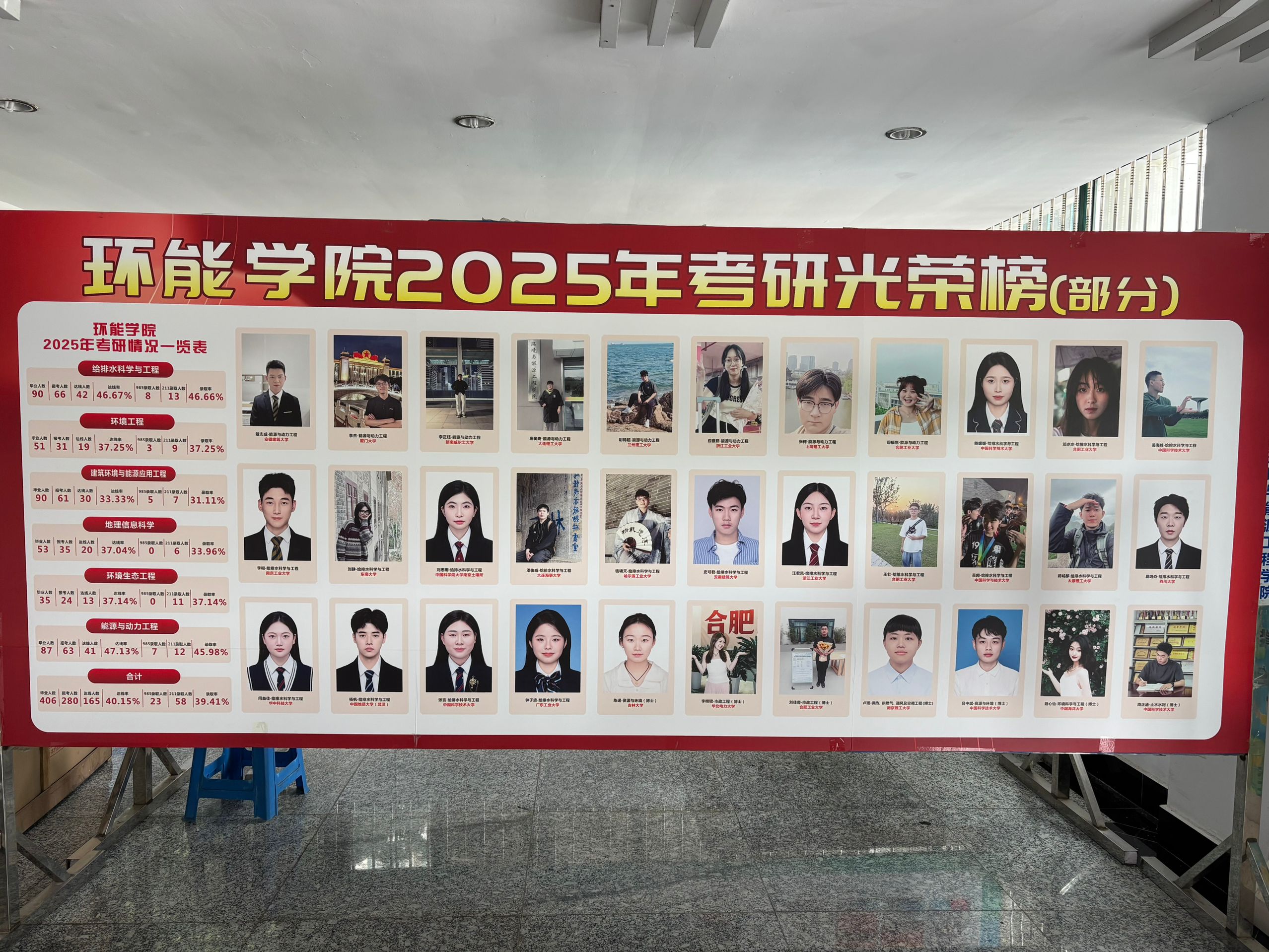 在环能学院报到点旁,一道独特而亮丽的风景线吸引了无数新生的目光——这便是我院精心设置的“考研光荣榜”展板。这已成为我院历年迎新工作中一项备受赞誉的传统特色。展板上清晰罗列着我院2025年考研的骄人成绩:全院考研录取率达39.41%,其中超过80名学子跻身国内211、985高等学府继续深造。近年来,我院考研工作依旧保持高位运行,录取率也依旧再创新高,更有2020级给排水专业张准准同学考入清华大学、2019级给排水专业8栋108宿舍全员上岸等考研佳绩在众多环能学子中口耳相传。