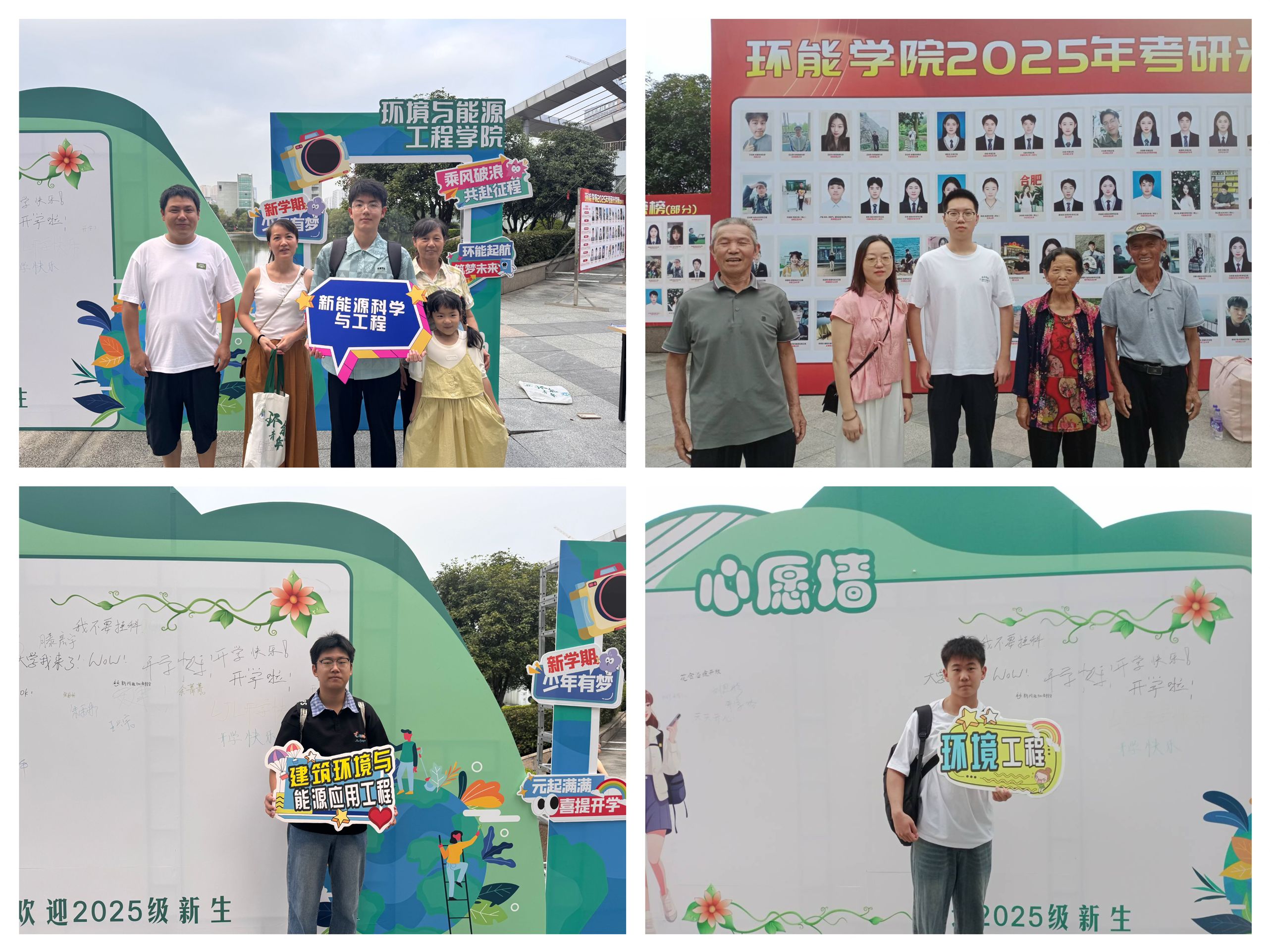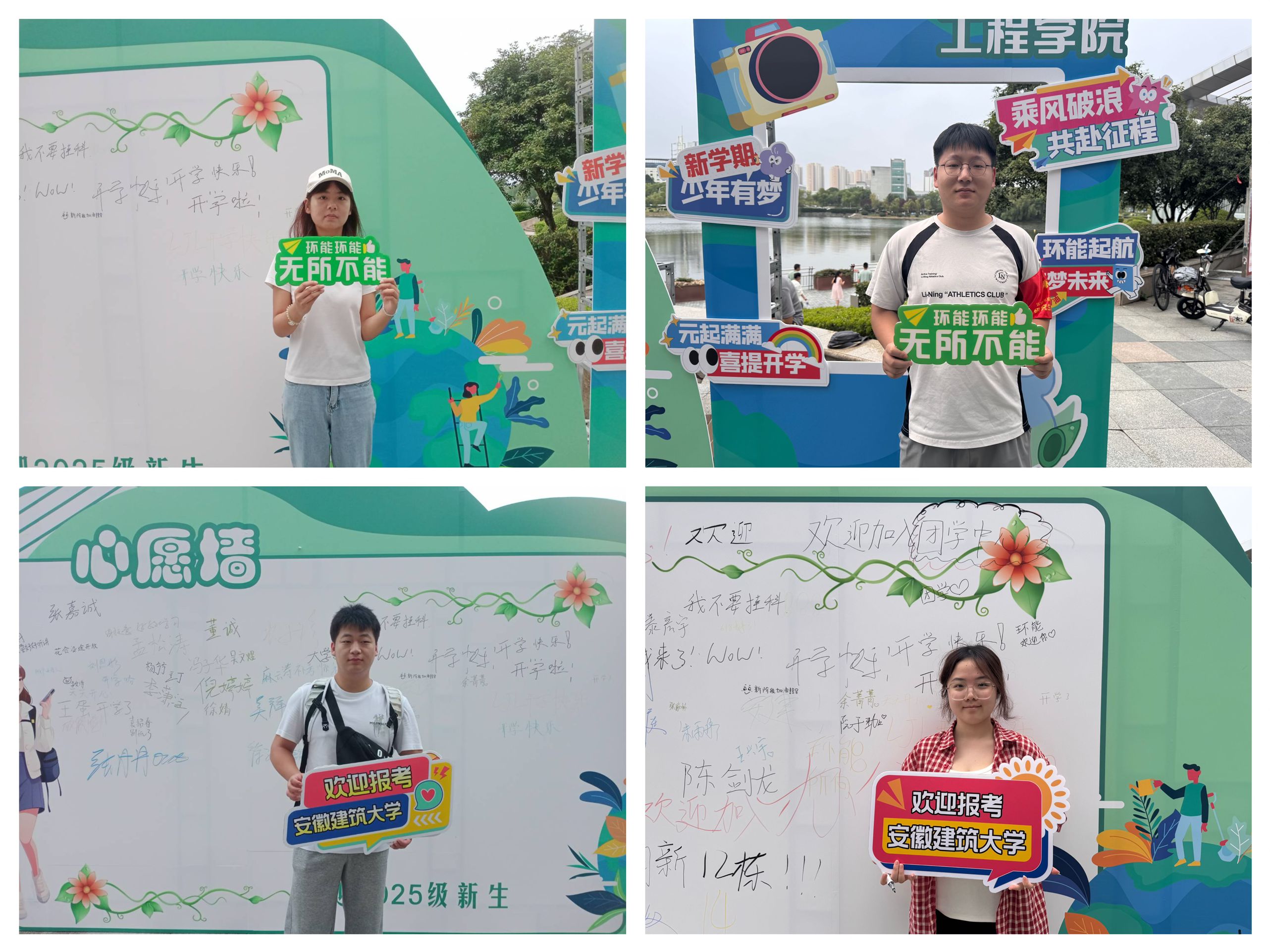在报到处的显眼位置,环能学院也设立了一副融入环能特色的定制相框,相框不仅印着学院专属标识,还巧妙融入了能源、生态相关的元素,尽显学科特色,吸引众多新生与家长前来打卡拍照,并提笔写下对大学生活的美好憧憬。于此同时,志愿者们也抓住机会,对正在合影留念的新生们进行采访。面对话筒和镜头,新生们既紧张又兴奋,纷纷畅谈自己对大学的初印象、所选专业的认识以及对未来生活的规划。