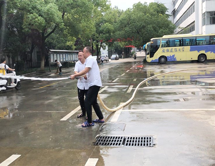 受极端天气影响,今年的汛期时间较长, 7月18日凌晨,合肥地区由于连日大雨和强降雨,造成北校区多处路面、图书馆、教学楼、多栋学生公寓积水严重,校园形成严重内涝,后勤干部职工冒着暴雨,不畏艰辛,始终奋战在抢险救灾一线。面对汛情,校领导第一时间到达现场,在实地察看汛情后,要求集团立即启动防汛应急预案,迅速展开灾情应急处置。集团领导班子靠前指挥,组织指导后勤相关部门人员及驻校物业公司进行防汛排涝抢险救灾等工作,合力迎战强降雨,经过多部门密切配合,协同合作,较短时间内恢复供电、畅通道路、消毒杀菌等工作,确保了师生生活秩序正常。