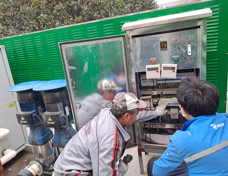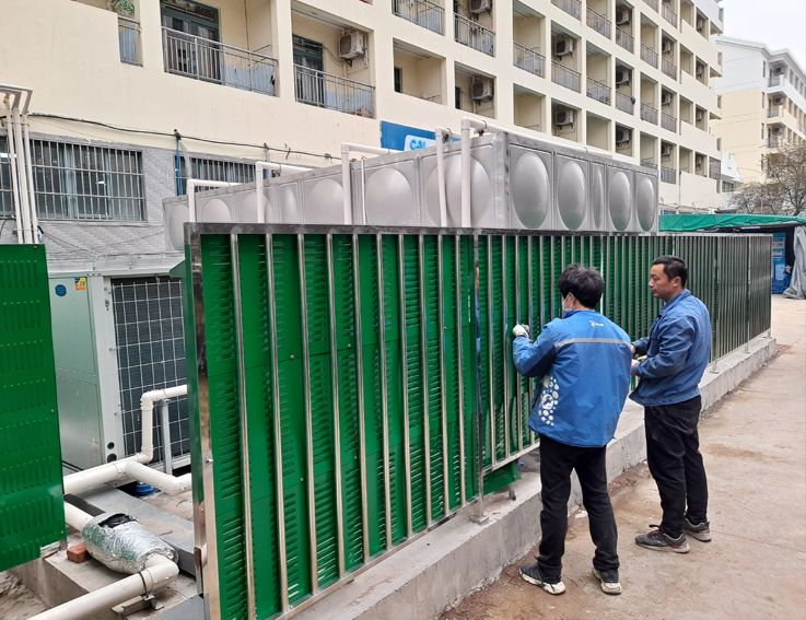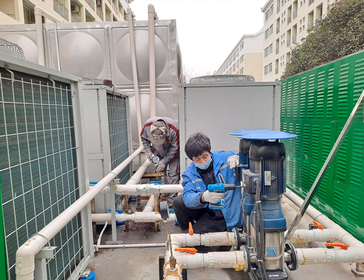 系统维护了学生公寓能源站空气源热泵系统的热泵机组、电控柜、水箱、加压水泵、控制阀、水管管网、水电表、电器线路、用水终端等设备,对水箱进行清洗、消毒、注水。调试维护工作持续一周,调试维护了17个能源站水箱、56台空气能、45台循环泵、28台增压泵,77间浴室。