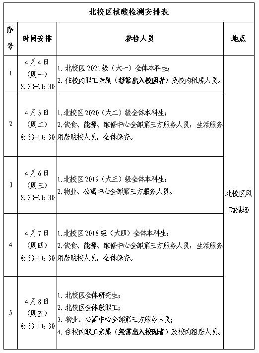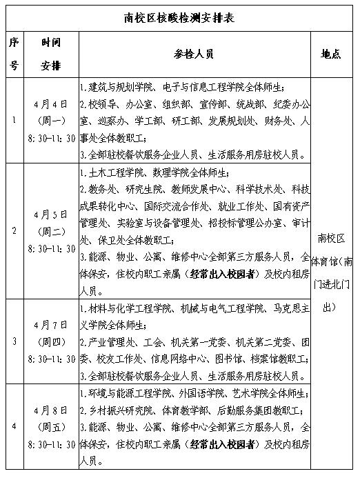 按上级疫情防控部门要求,4月4—8日,学校继续组织师生开展核酸检测,做到一周全覆盖。其中住校外教职工(除下表已安排到本单位的1次检测,另外1次根据核酸检测时间安排表自选)、住校内职工亲属(经常出入校园者)及校内租房人员、第三方人员每周至少参加核酸检测2次,具体安排如下: