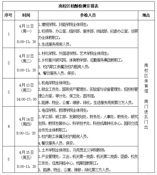 按上级疫情防控部门要求,4月11—15日,学校开展本学期第五轮全员核酸检测,做到一周全覆盖,其中教职工(除下表已安排到本单位的1次检测,另外1次根据核酸检测时间安排表自选,两次核酸检测时间间隔至少48小时)、住校内职工亲属及校内租房人员、第三方服务人员每周至少参加核酸检测2次,具体安排如下: