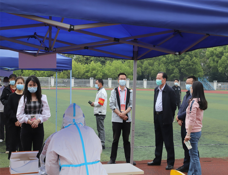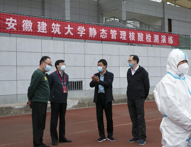本网讯  4月17日,学校在南、北校区同时开展疫情防控校园静态管理核酸检测演练。校党委书记孙道胜,校党委常委、副校长蔡新立分别深入南、北校区演练现场,检查指导工作。