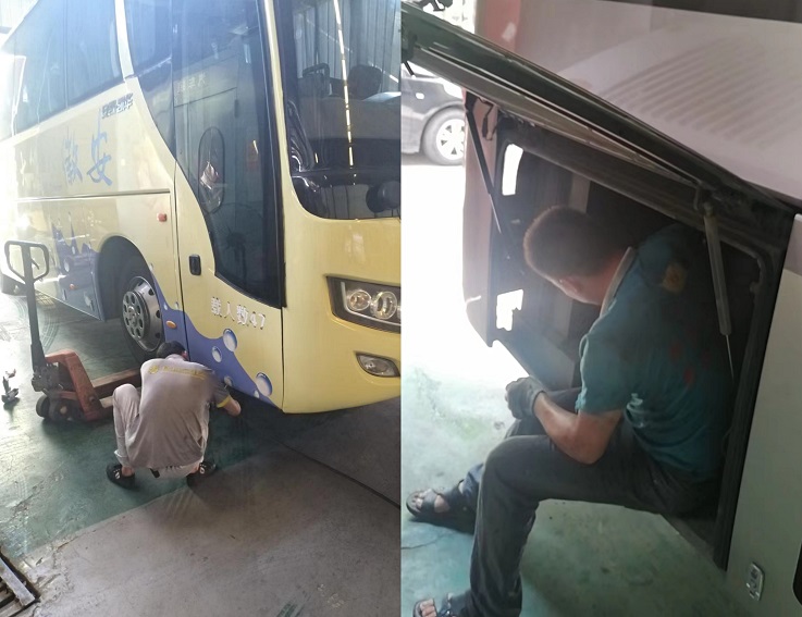 后勤服务集团校车队利用暑假时间集中检查车辆运行情况,由专业人员制动、转向、传动、轮胎、灯光系统和灭火器、安全带、安全锤等设施设备进行全面检查,对校车进行统一的保养以便开学后乘车师生提供更加优质的校车服务。/图:张川;审稿:唐黎