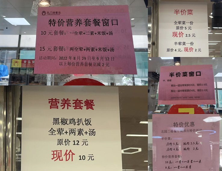 学生返校后,学校实施临时校园封闭管理,为了体现学校人文关怀,后勤服务集团提前谋划,精心准备了系列活动。自2022年秋季学期开学以来,学校各食堂相继推出特价营养套餐、特价营养汤、半价菜等一系列让利优惠爱心活动,传递学校对每个学子的关爱之情。