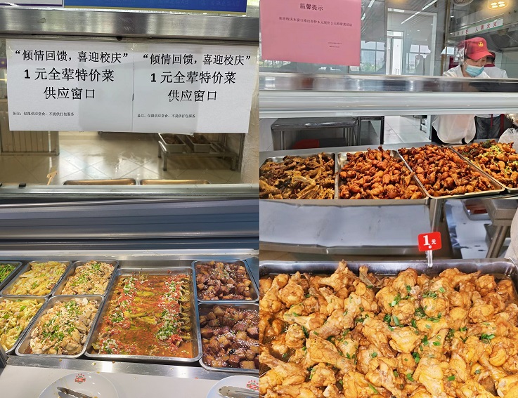 为使广大校友感受到“家”的温馨,回味学生时代的味道,找回过往已久的记忆,后勤集团倾心打造了“校友自助餐”和“校庆学生餐”,饮食中心员工以温馨喜庆的就餐环境,饱满真挚的服务热情,让嘉宾和广大师生校友品味和体验了一场经典“安建大味道”的美食盛宴。为确保师生吃上新鲜、上乘的菜品,各食堂严把食材验收检验关,加大巡检频次,加班加点精心备餐。各级管理人员全部驻守一线,全力保障供餐服务。此外,学校食堂推出“倾情回馈,喜迎校庆”活动,5月4日和5月5日午餐提供1元全荤特价菜,为校庆增光添彩。