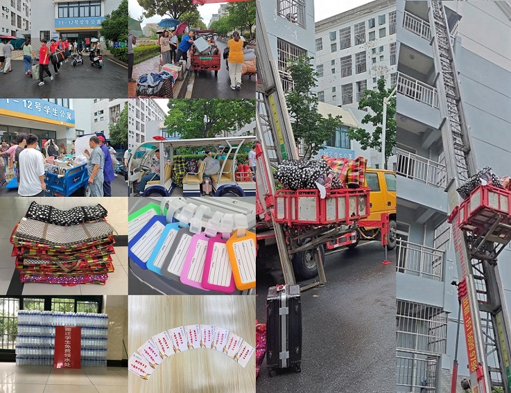 完成一次搬迁,解决实际困难。为改善学生住宿环境,暑期对南校区2栋学生公寓进行全面维修,6月25日,启动南校区11#、14#楼内居住的1321名学生搬迁工作。为解决学生搬上搬下行李的难题,租赁4台云梯,运行约1000余次,组建志愿服务车队,帮助同学们运送行李。此外,为搬迁学生准备了3000个编织袋、行李标牌,2000瓶矿泉水,4桶绿豆汤,1500张搬迁餐券,全力以赴保障搬迁工作顺利完成。