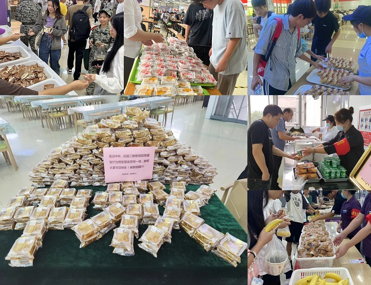 同赏一轮明月,共享建大情怀。独在异乡为异客,每逢佳节倍思亲,为让来自五湖四海的在校学生感受家的温暖,组织开展“喜迎中秋,欢度国庆”活动。9月26日,后勤组织工作人员在学校易海撒网捕鱼,食堂员工负责将捕捞上来的鱼运送至食堂进行加工,当天晚餐,各家食堂精心烹饪的红烧鱼块、剁椒鱼头、香辣鱼块等美食免费供给师生品尝,让同学们真实感受到了安建大的暖暖心意。9月28日,后勤为广大师生准备了定制的“建大月饼”,各食堂也免费为师生赠送水果及酸奶等,为他们送去节日的礼物和祝福。月饼虽小,却承载着浓浓的情意,传达的不仅是美味,更是学校对广大师生的一份关心和温暖。