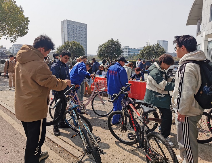 手缝机踩,熨烫衣物,阿姨们几分钟变更修补破损、脱线的衣物,老虎钳、螺丝刀各式工具一应俱全,维修师傅们修旧起废,不一会就将同学们的自行车、小电器维修完成。
