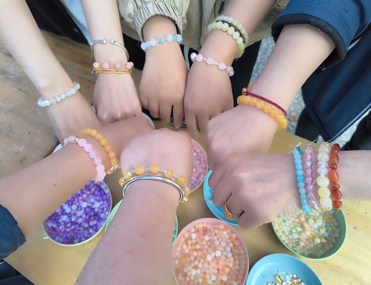 本次活动准备了大量的串珠供学生们手编,下着毛毛细雨,也阻挡不了同学们的热情,每一位同学都专心串珠,沉浸其中,尽情的发挥想象和创作力,编制自己喜欢的手链,在一双双巧手的打造下,纤细的珠线和一颗颗圆润如玉的珠子浑然天成般组合在一起,变成了一串串精致养眼的珠宝手链。看着自己手上闪闪发光的小手链,大家脸上洋溢着高兴满意的笑容。