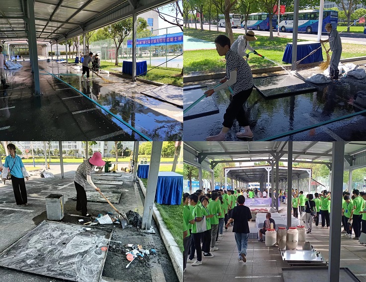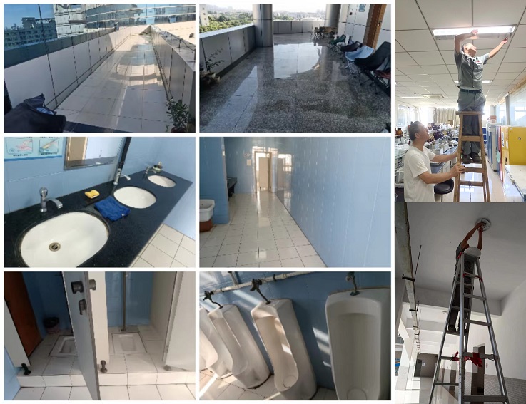 在坚持例行教室及楼道清洁、校园保洁,垃圾清运、道路清扫工作不停歇的基础上,进一步加大校园及楼宇卫生死角清理,对教室课桌椅、窗帘、黑板、照明等设备设施进行全面检修维护,为假期留校学生提供良好的生活和学习环境。同时,为学校举办第七届全国大学生混凝土大赛等大型活动做好物业保洁及服务保障。