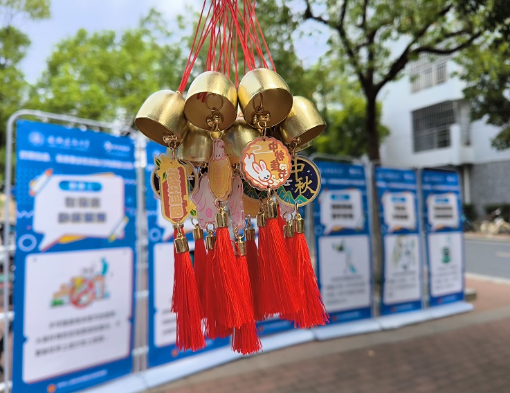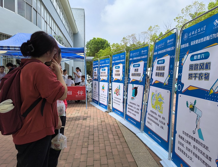 现场准备了一系列宣传展架,涵盖宿舍用电、用火、卫生安全、防电信诈骗等内容,通过安全知识展览+宿舍安全知识答题互动相结合,并准备中秋小挂件、钥匙扣等小礼物,吸引了过往同学们的积极参与。