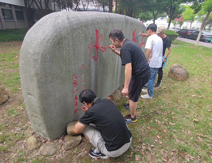 石雕景观大多由历届校友赠送,饱含校友们的绻绻之情,在校园文化中扮演着重要的角色,不仅能为校园增添艺术魅力,还能体现出学校的文化底蕴和精神风貌。看着历经风吹日晒而日益褪色的石雕文字,后勤管理处党总支组织党员同志们对紫云路校区内的景观石进行描红增色,“补妆”后的石刻焕然一新,让人赏心悦目。