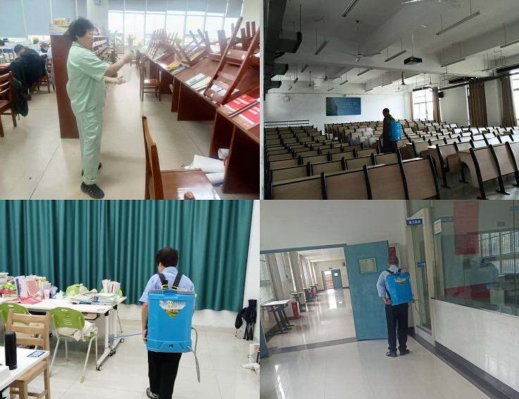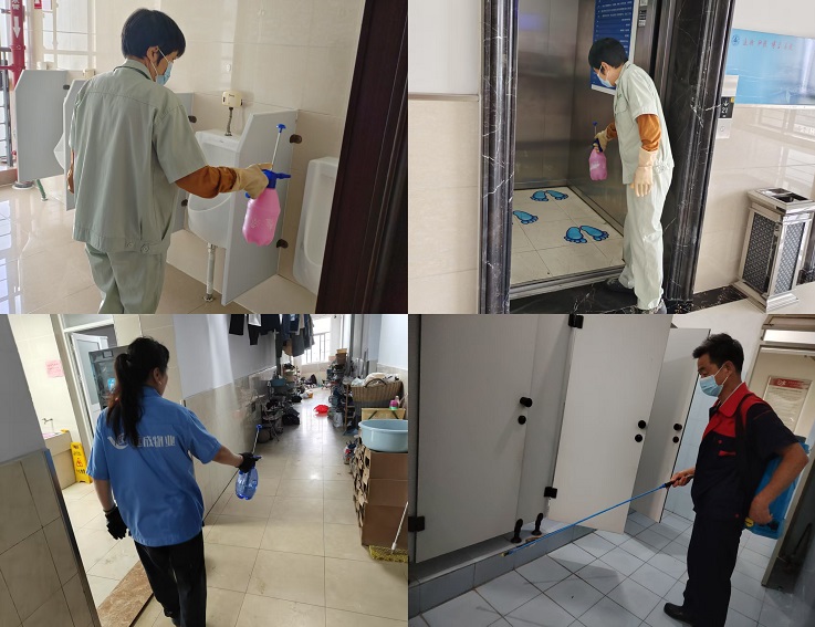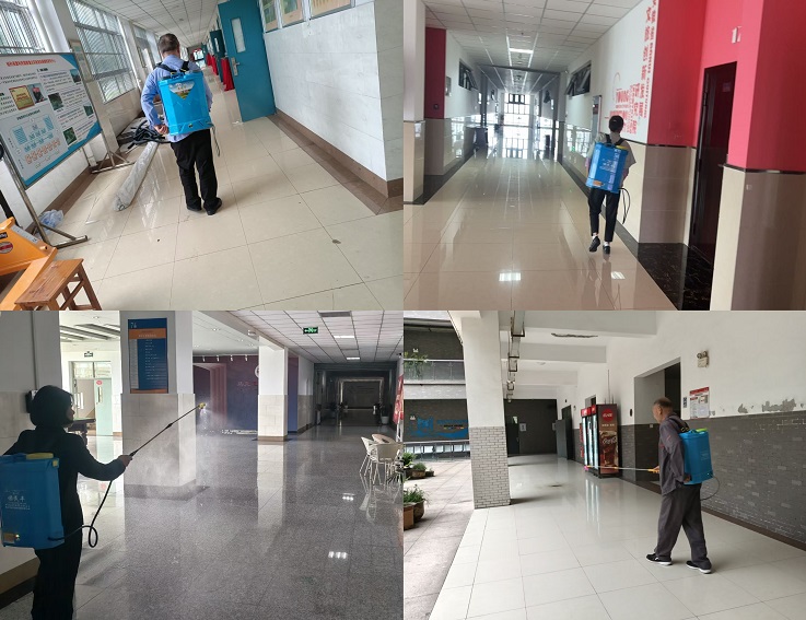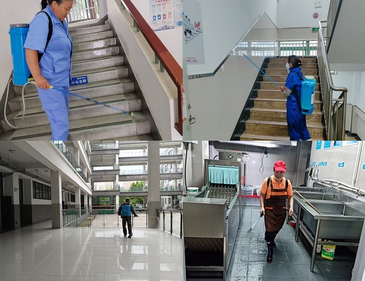 后勤管理处组织专业消杀队伍,对全校教学楼、宿舍楼、食堂、图书馆、体育馆、校医院、卫生间等公共区域进行全面消杀。工作人员严格按照卫生消杀管理的标准规范操作,采用科学配比的消毒液,对门把手、楼梯扶手、电梯按钮、桌椅等高频接触部位进行重点擦拭消毒;对教室、宿舍等人员密集场所进行空气喷雾消毒,确保消毒无盲区、无死角。