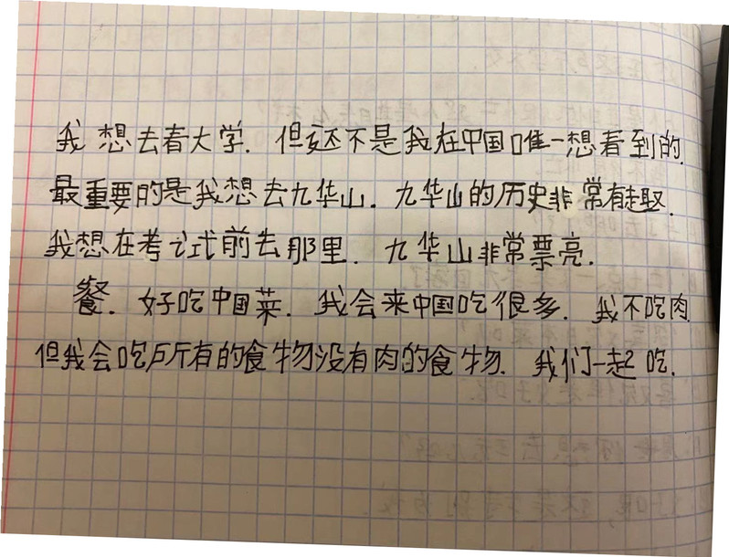 在讲座过程中,留学生们展现出了强烈的兴趣,不时地与主讲人互动交流。讲座结束后,学生们纷纷表示,虽然由于疫情原因,他们暂时还不能来华学习,不能身临其境地感受中国文化、安徽文化,但此次讲座给了他们一个很好的机会去了解安徽、了解学校,进一步激发了他们知华、友华、爱华的热情。留学生们饶有兴致地用目前所学习的汉语记录下他们参加此次讲座的心得体会。