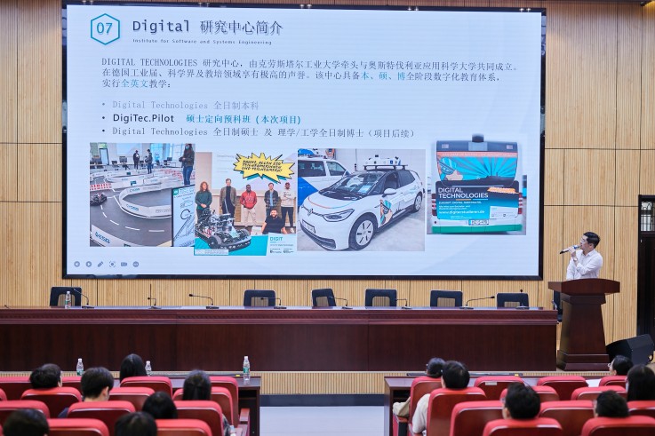 本网讯 5月17日,德国克劳斯塔尔工业大学-奥斯特法利亚应用科学大学联合培养数字化科学专业硕士定向预科班(DIGIT-Pilot)项目说明会在我校南校区实训楼二楼报告厅举行。国际交流合作处相关负责人、DIGIT-Pilot项目中国区代表、电信、材化、环能及外国语等相关学院近100名学生参加说明会。