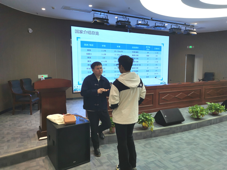 讲座结束后,随即开启学生现场提问环节。同学们围绕特定专业申请要求、留学国家生活成本、奖学金申请细则等问题踊跃向讲师请教,讲师凭借丰富经验与专业知识耐心解答,现场互动热烈。