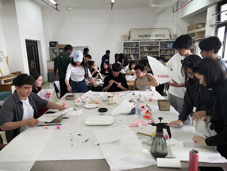 课堂上,非遗“传拓技艺”的沉浸式体验成为最具人气的文化磁场。留学生们亲手将斑驳的秦砖汉瓦上的文字拓印成幅,透过宣纸与历史的对话,见证汉字从金石载体跃升为艺术表达的奇妙嬗变。在国际学院现代化教室内,不同文化背景的留学生们屏息悬腕,以笔墨构筑文化桥梁—— “我爱中国”“我爱建筑大学”“禅”“艺无止境”等作品跃然纸上,一笔一画间尽显跨文化理解与交融。