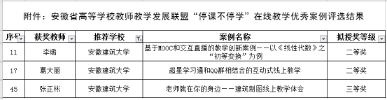 本网讯  我校三位教师在安徽省高等学校教师教学发展联盟“停课不停学”在线教学优秀案例评选中获得佳绩。其中,数理学院李璐、土木工程学院葛大丽获得二等奖,机械与电气工程学院张正彬获得三等奖。