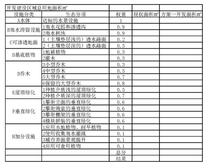 初步拟定上述绿色基础设施分类的生态分项并统计列表,作为校园 GSF 工具的初始表格。并规定绿色基础设施在满足多个生态分项时,可以叠加计算。