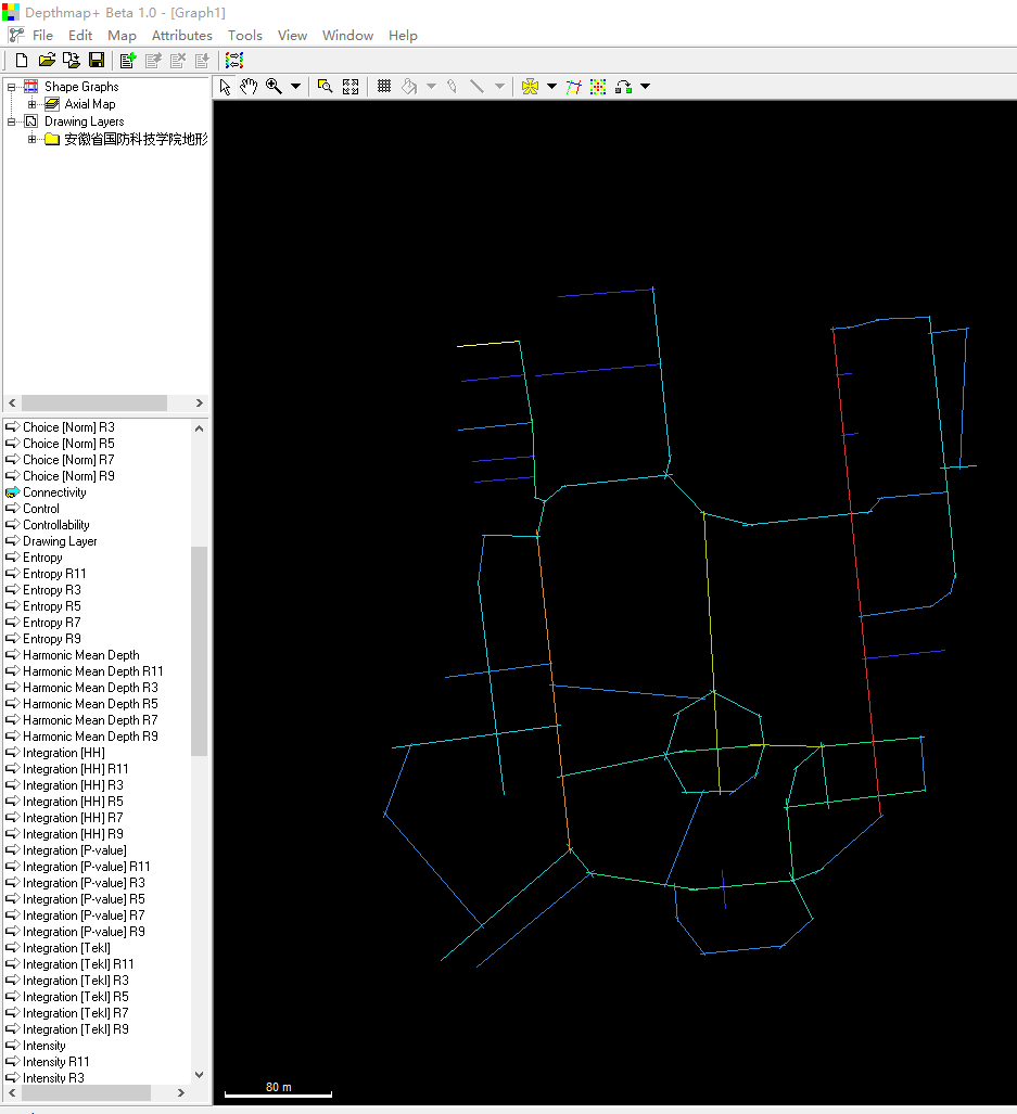 以下面轴线分析的图为例,轴线的颜色越暖说明轴线所代表路径的整合度越高,即这条路径在整个系统中的可达性越高。轴线的整合度随着红橙黄绿青蓝紫颜色的变冷而降低,表示相应的路径在整个系统中的可达性也随着降低。中间的十字型交叉路径整合度最高(整合度值1.55),可达性也最高。而北侧的末端路径呈整合度低(整合度值0.51)的蓝紫色,说明这些路径在可达性偏低。(见图一)