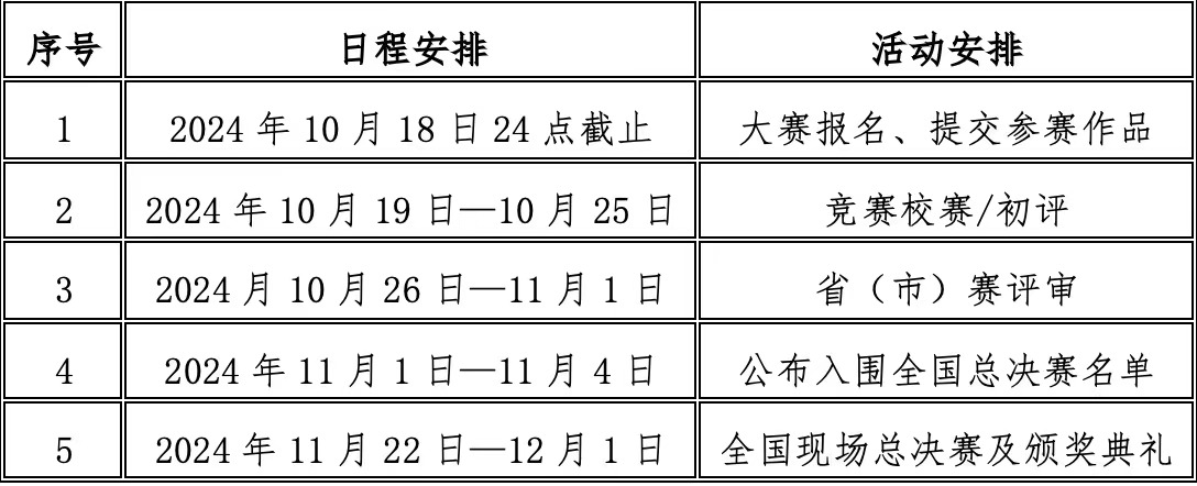 2024年整体赛事工作部署,赛程分为:校级初赛省(市)赛评审全国总决赛三个阶段;各赛程设置及具体安排详见附件《竞赛指南》。