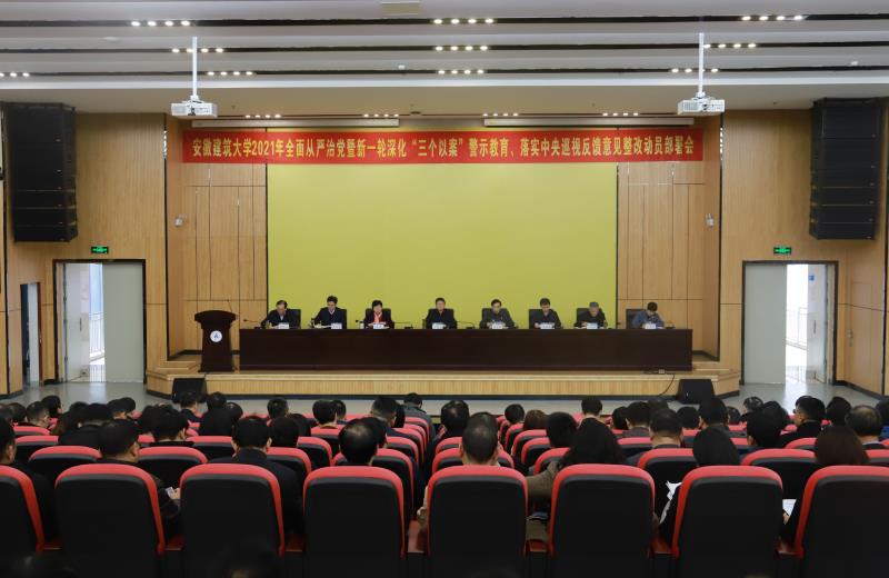 本网讯  3月16,学校在南区实验综合楼二楼报告厅召开全面从严治党暨新一轮深化“三个以案”警示教育、落实中央巡视安徽反馈意见整改动员部署大会。校党委书记方潜生对2021年全面从严治党工作进行部署,对新一轮深化“三个以案”警示教育作动员讲话。校党委副书记、校长孙道胜主持会议,并对学校落实中央巡视安徽反馈意见整改进行动员。校领导吕萍、成祖德、黄显怀、丁克伟、蔡新立、王玉兰出席会议,校党委委员、纪委委员,全校副处级以上干部,学校党风党纪监督员、特邀监察员参加会议。