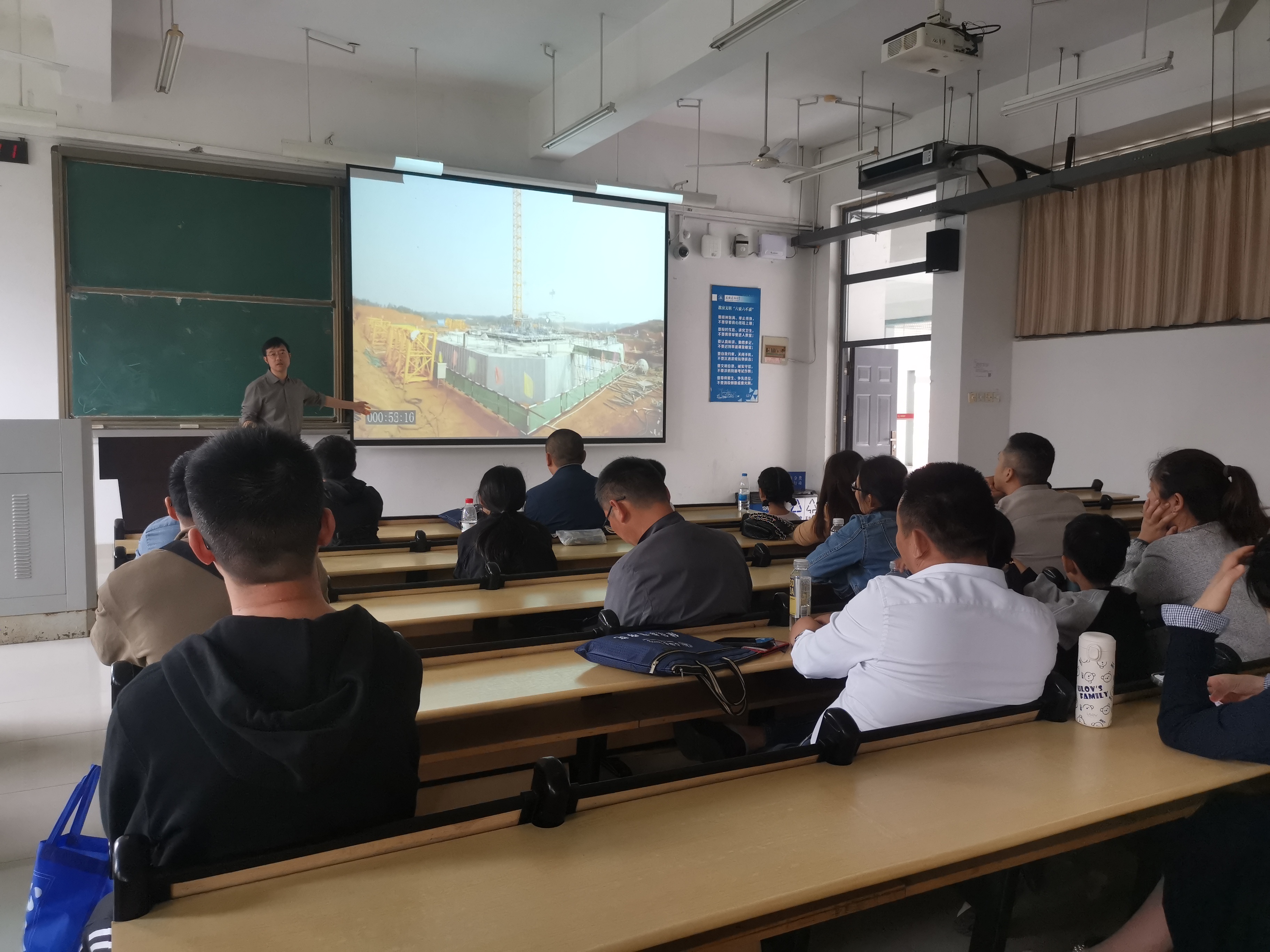 随后,土木工程学院陈东教授在学校逸夫楼教室给同学们做报告,陈老师向大家介绍了当前土木建筑发展趋势及未来发展方向,bim及集成装配式技术,智慧建造,绿色建造,3D打印等一系列新技术,新工艺,新方法。在提问交流环节,陈老师对同学们的提问和困惑都逐一做了热心回答。
