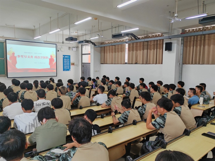 原机电学院2019级测控专业学生、现某学院大三学生王伟担任学校本次新生军训的教官,他围绕“当兵的契机,军旅生活难忘的瞬间,当兵的未来选择”三个方面,为同学们生动描绘了参军报国、建功军营的美好蓝图,为同学们算好参军入伍的“政治账”“经济账”“发展账”,鼓励青年学子携笔从戎、报效祖国,更以自己的成长故事激励在场的每一位学生到军营中体验别样青春、书写精彩人生,用青春热血助力强军梦想。