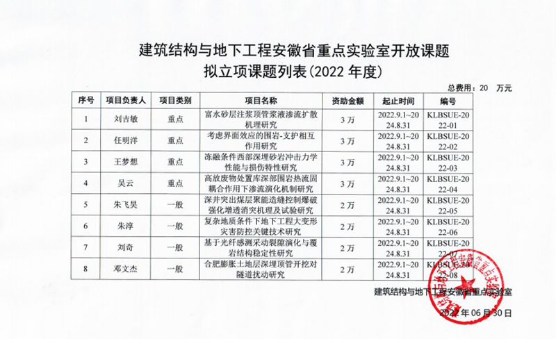 附表-建筑结构与地下工程安徽省重点实验室开放课题拟立项课题列表(2022年度)