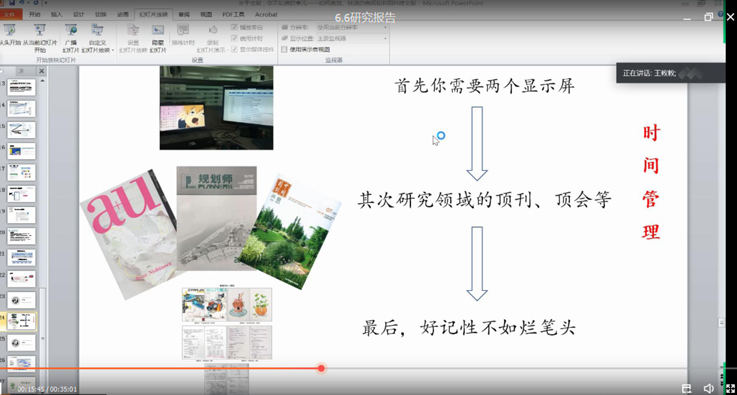 会议到中期时气氛愈加热烈,王老师一边介绍国内外顶级科研杂志期刊一边与参会学生展开交流,不少在家学生提出了自己的问题,王老师结合业内水平和专业相关推荐了一批适合研究生搜索利用的外文期刊。此外,王老师强调了在阅读文献时的一些技巧和忌讳,如有条件可以同时使用两个显示屏,可以极大提高文献学习记录的效率,其次就是要积极关注学界的顶级期刊和顶会,及时了解行业最新动向为自己的研究提供灵感方向,最后王老师强调好记性比不过烂笔头,作为学者唯有做好笔记经常温习才能温故而知新,稳定向前的进行科学研究。