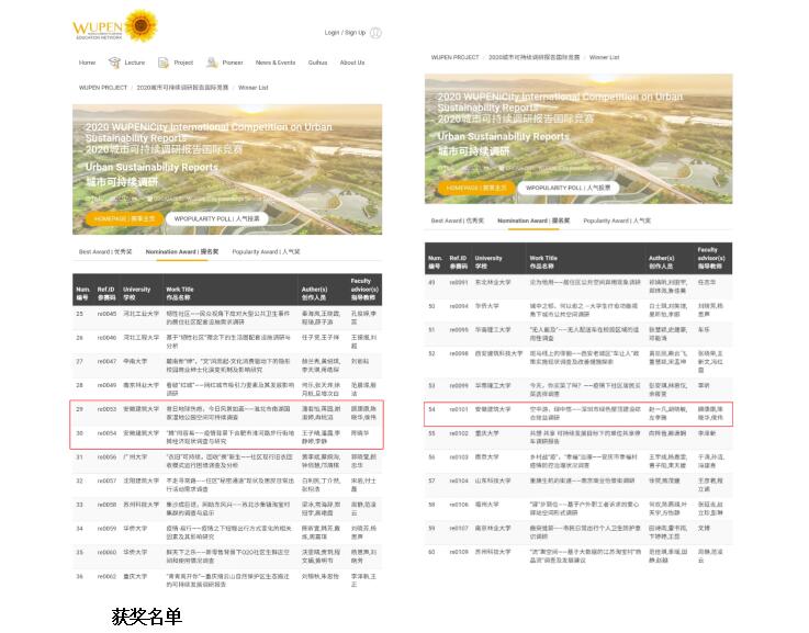 本网讯近日,首次由WUPEN世界规划教育组织、联合国教科文组织iCity网站、Guihua杂志联合举办的国际赛事 “2020城市可持续调研报告国际竞赛”获奖名单公布,建筑与规划学院2017级城乡规划专业本科生三份作品获得提名奖荣誉,获奖率在全国高校中名列前茅。