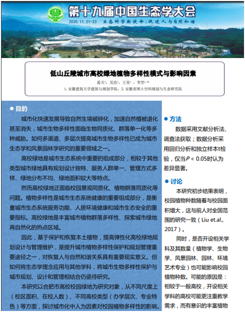本网讯  1121日,第十九届中国生态学大会采用线上会议形式举行,我院18级风景园林专业三位学生以“低山丘陵城市高校绿地植物多样性模式与影响因素”为题参展“城市和城市群生态系统健康与生态修复”分会场,并入选本次学术大会电子墙报展。