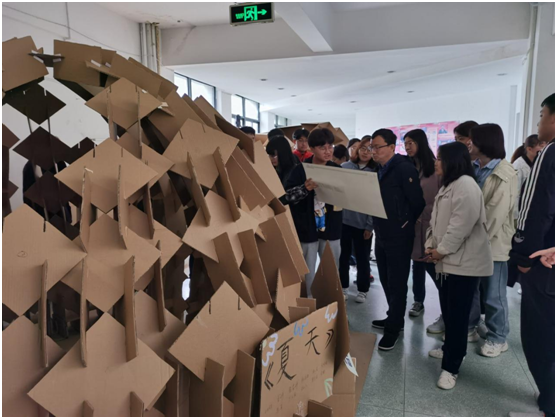 每组建造作品旁摆设图纸,由组长进行设计思路和建造作品讲解,而后评审组针对作品进行提问和审评。评审组给出点评并提出改进方案,希望一年级学生从这次作业中汲取经验,为今后的学习做好铺垫。