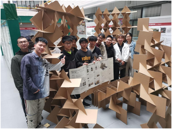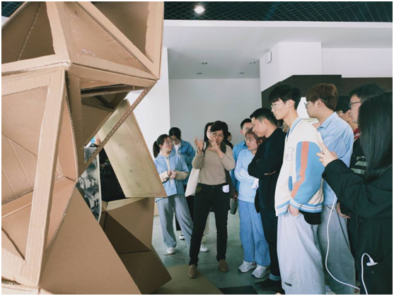 本次建造课题历时4周,课题要求学生利用瓦楞纸板在3mx3mx3m空间内展开建造,完成一个主题突出的适合人体活动的实体空间。此次课题旨在让学生通过实践感知加深对真实材料和空间尺度的把握。学生对此次课题充满热情,在经历了初期对材料的研究学习、多方案评比择优、1:5模型改进、1:1模型试搭后确定最终方案,一天之内完成实体搭建。